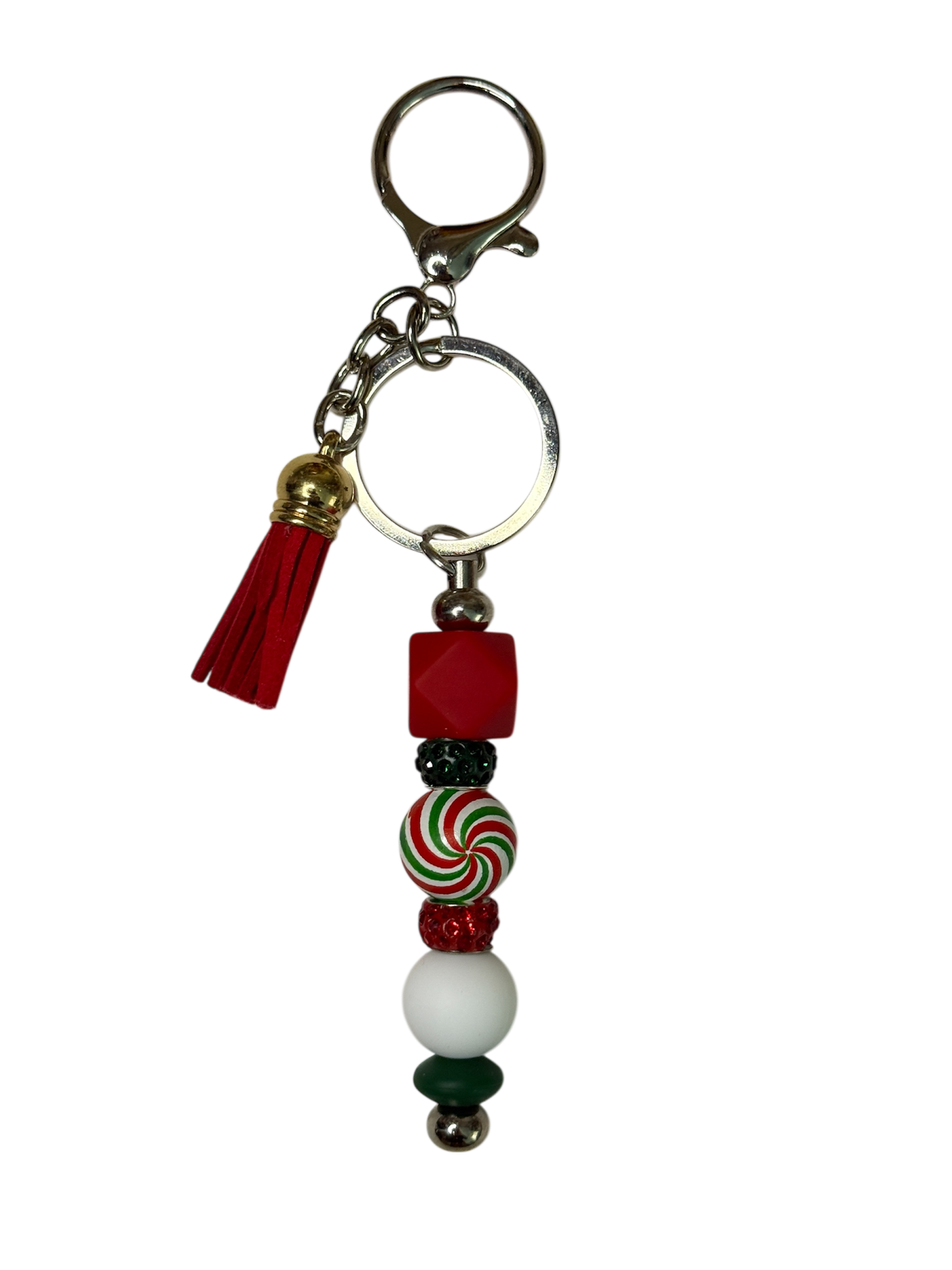 Handmade Christmas keychain with festive red, green, and white beads, featuring candy-style swirls and glittery accents. Completed with a red tassel and silver clasp, it’s ideal for adding a holiday touch to your keys, bag, or backpack. A small but delightful Christmas gift idea!
